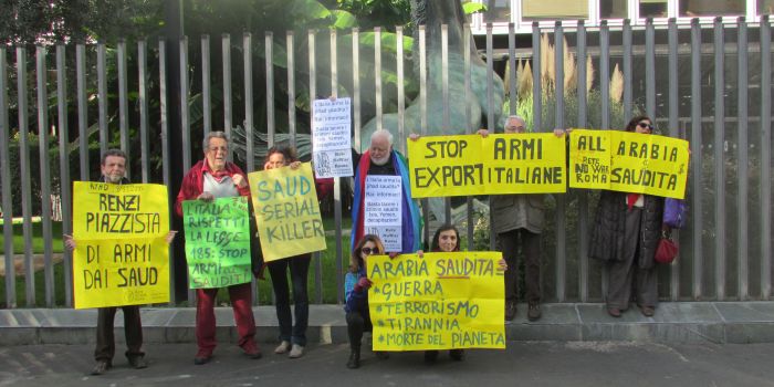 tacere i crimini sauditi: Isis, guerra in Yemen, decapitazion i"; " Renzi piazzista di armi dai Saud", " L'Italia rispetti la legge 185".