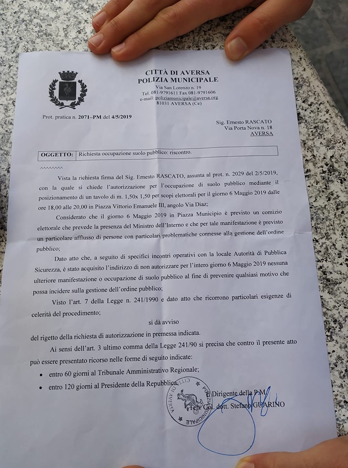 – il Ministero dell’Interno, casualmente diretto da un “competitor elettorale” ha risposto che “meglio di no, quel giorno Aversa deve essere a disposizione soltanto di Salvini”, con tanto di concentramento eccezionale delle forze di polizia.