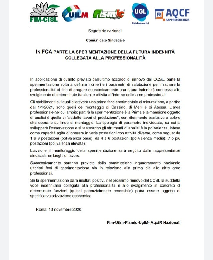 In FCA parte la sperimentazione della futura indennità collegata alla capacità dell’operaio di linea di saltare da una postazione all’altra. Lo comunicano soddisfatti i sindacati a libro paga del padrone.