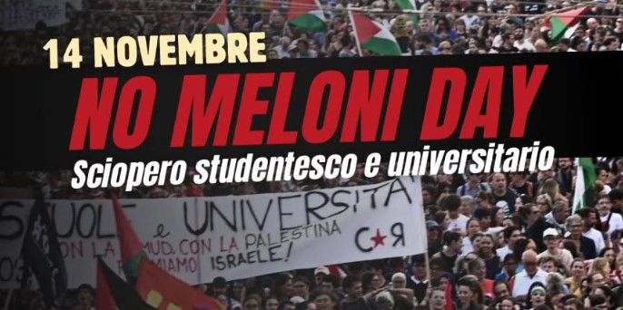 Il Governo Meloni non ci rappresenta, ha perso ogni credibilità politica, lasciandoci nella crisi in cui siamo, ed etica, sostenendo Israele e le guerre. Se non vogliono sentire il dissenso se ne faranno una ragione: il 14 novembre svuoteremo le scuole e gli atenei per un grande sciopero studentesco che sfiducia il governo, il 14 novembre sarà #NOMELONIDAY per dire no alle politiche del governo e sì a una Nuova Formazione Pubblica, alla Palestina Libera, a un Mondo Nuovo.